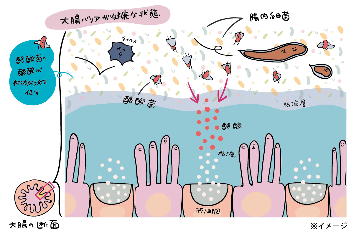 まず、感染予防で大切なポイントは2つあります。1つは、ウイルスや細菌などの病原体から物理的な距離をとって接触しないこと。もう1つは、万が一病原体が侵入してきたとしても、ただちに排除することです。酪酸は後者に大きく関わっているといわれています。